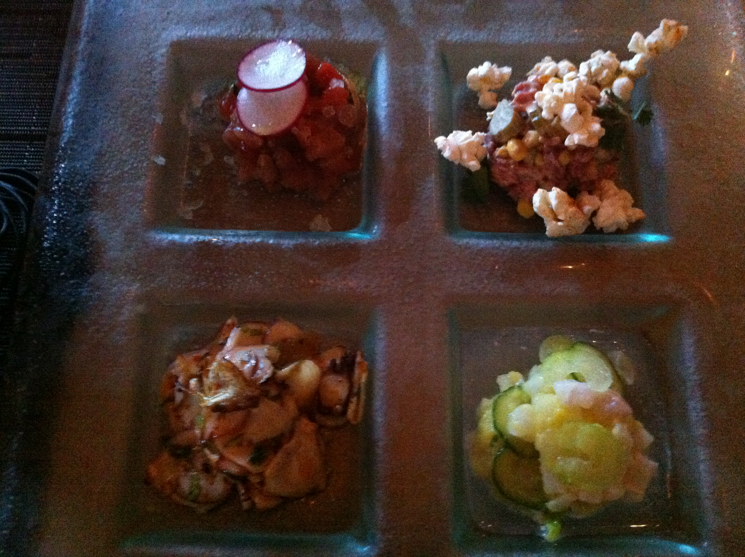 We s-tartared it up with a sampling of the Edge’s four signature tartares: Beef Tenderloin with Corn Chipotle, Yellow Mustard Seed and Gherkins; Corvina with Baby Cucumber, Green Apple and Celery Leaf Yellow Pepper Sauce; Octopus with Baby Artichokes, Cilantro Charred Tomato Salsa and Saffron; and Ahi Tuna with Pickled Shallots and Watermelon Italian Parsley. The Octopus had, by far, the most interesting and unique flavors, but my favorite was the Corvina. Tartares are making a culinary comeback from the late seventies – early eighties where beef tartare was a menu standard, not to mention served at all of our parties.