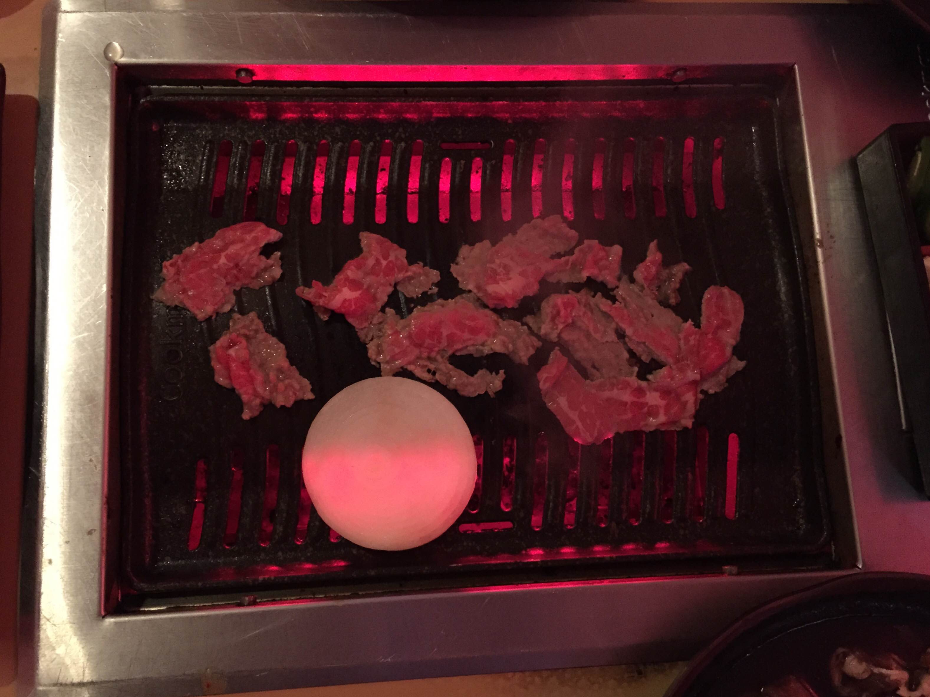 We skipped over the sushi and went straight for the Korean bbq, replete with in-table hibachi style cooking referred to as the “ondol.” Side dishes of marinated mushrooms, potatoes, bean sprouts, tofu and delicious kimchee began our Korean experience, courtesy of the house. Add to that a bottle of Soju and the evening kicked into high gear.