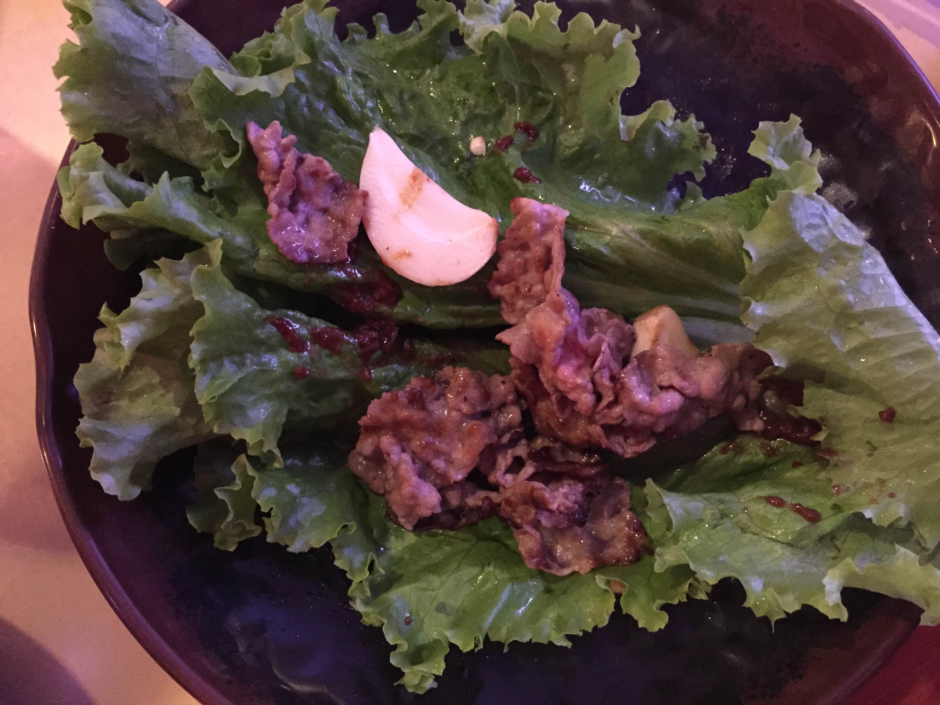 Next came the platters of raw beef, beef ribs, shredded pork and pork belly that were served with thick slices of onion and intensely strong garlic. Once cooked, the meats, vegetables and garlic are wrapped in lettuce leaves and drizzled with salt and pepper sesame oil or a special Korean sauce. We threw the kimchee in everything. The meats were very good but not top cuts. We enjoyed all of them except the pork belly which was very tough and not the expected melt in your mouth fat. Skip this one dish but do try Shilla. We are definitely going back.